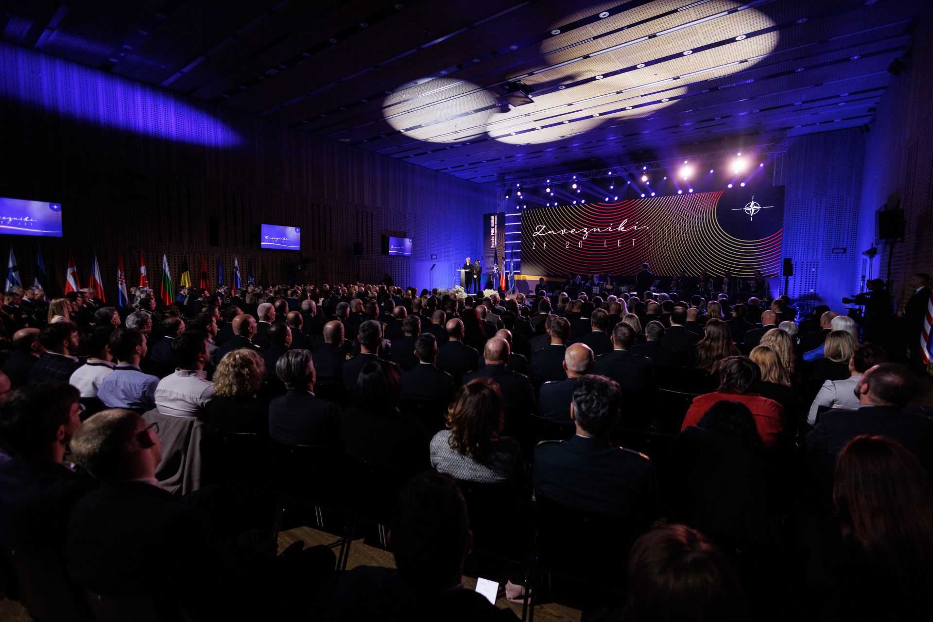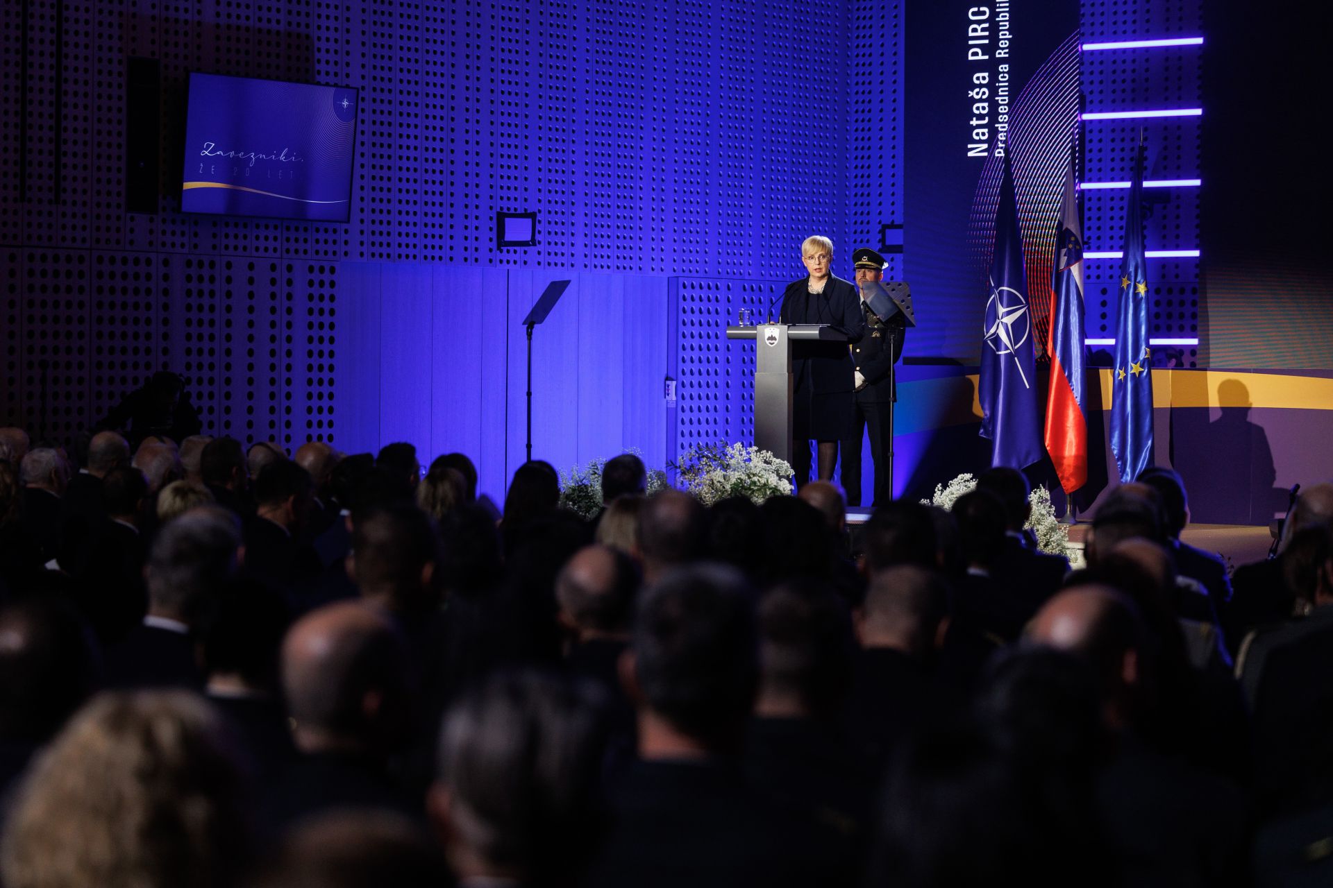 In her speech, President Pirc Musar highlighted that, despite working together to find effective solutions to regional and global challenges, common values and international legal forms are under increasing pressure. She drew attention to the wars in Ukraine and Gaza and other conflicts around the world, where the use of force is still a means to an end, a means to shift the borders of sovereign states and an attempt to subjugate nations. She condemned any interference in the lives of fellow human beings, their suffering and torture, their humiliation, and sexual violence against them, which we see in the fields of war. "NATO's commitment to defend those countries that uphold these values is enshrined in several provisions of the Washington Treaty. It is therefore only right to be a member of this international organisation and to celebrate the twentieth anniversary of our membership today," she emphasised.