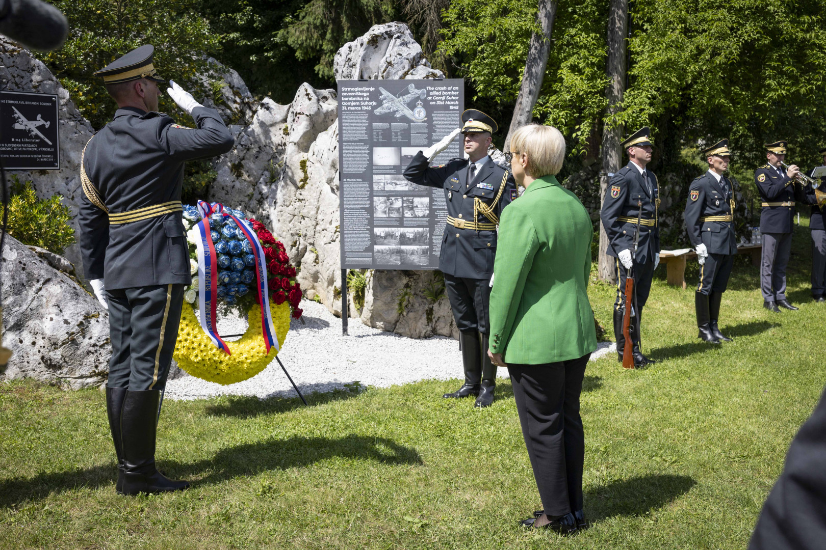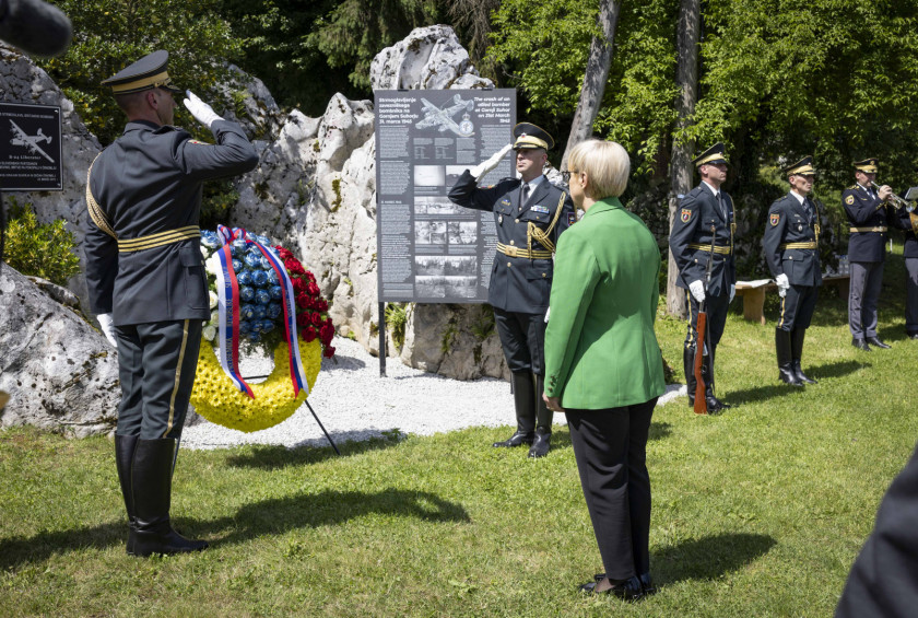 The President of the Republic of Slovenia, Nataša Pirc Musar, attended the traditional ceremony marking Slovenia-UK Friendship Day. On the 80th anniversary of the end of the Second World War, she highlighted the importance of the local community's assistance to the British airmen at that time and of Allied cooperation in the fight against fascism and Nazism. She also laid a wreath at the memorial plaque to commemorate the fallen crew members of the downed B-24 bomber Liberator VI. British Ambassador Victoria Harrison and Air Vice-Marshal Simon Edwards of the Royal Air Force also attended the ceremony.