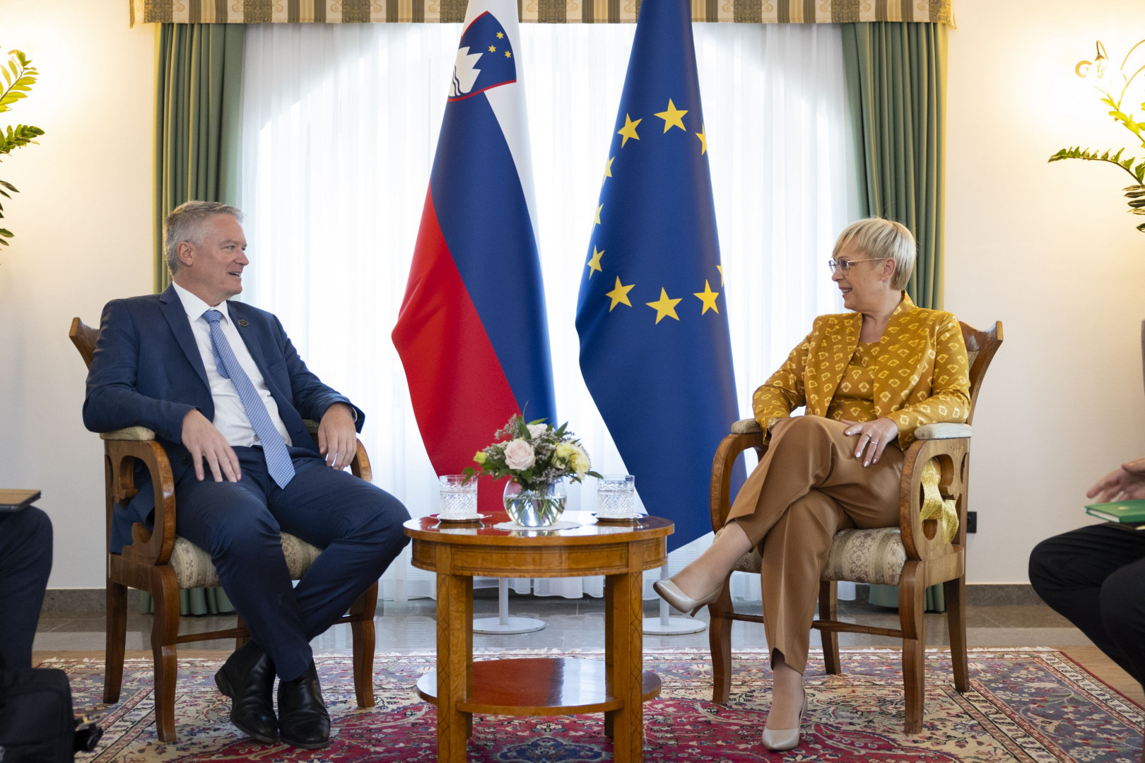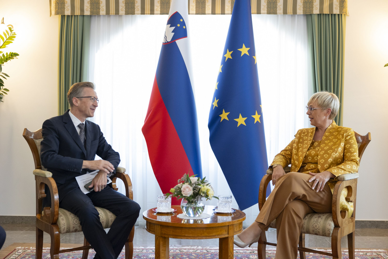She and OECD Secretary-General Mathias Cormann discussed the importance of multilateralism and Slovenia's role in the OECD. The President praised the work that the OECD is doing to promote gender equality and empower women and girls. During her discussion with Council of Europe Commissioner Michael O'Flaherty, she spoke about the importance of protecting and enforcing human rights, with particular emphasis on gender equality and the rights of children, the elderly, minorities and other vulnerable groups. They also discussed the role of the Council of Europe in further codifying the new right to a clean and healthy environment. On the margins of the Bled Strategic Forum, the President also met with Steffen Lang, a member of the Novartis Executive Committee and President of Operations. Dr Lang explained that more than 47% of the company's management positions are held by women, and they also discussed the role of artificial intelligence in medicine and the pharmaceutical industry, as well as cooperation with universities and young researchers.