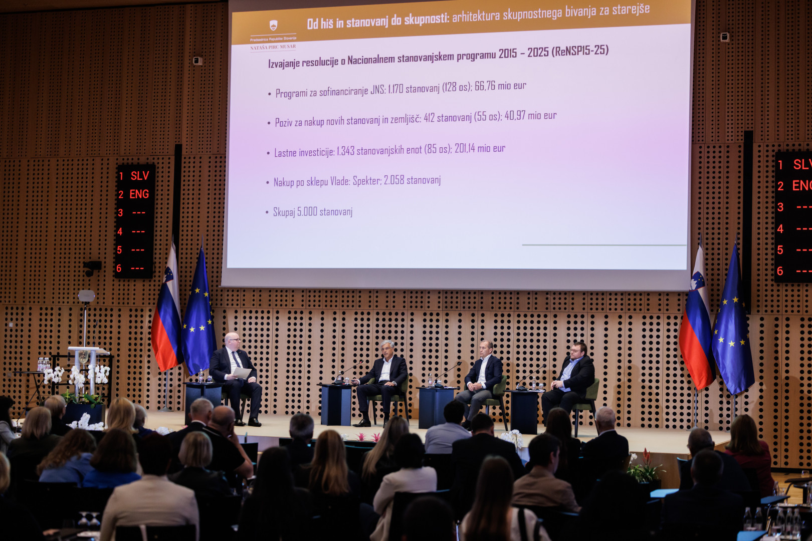 Panelisti: dr. Wolfgang Amann, direktor avstrijskega inštituta IIBW, mag. Črtomir Remec, direktor Stanovanjskega sklada RS, Mitja Križaj, glavni direktor DSU d.o.o. ter Simon Maljevac, minister za solidarno prihodnost.