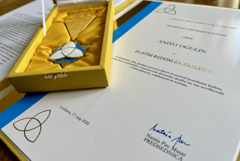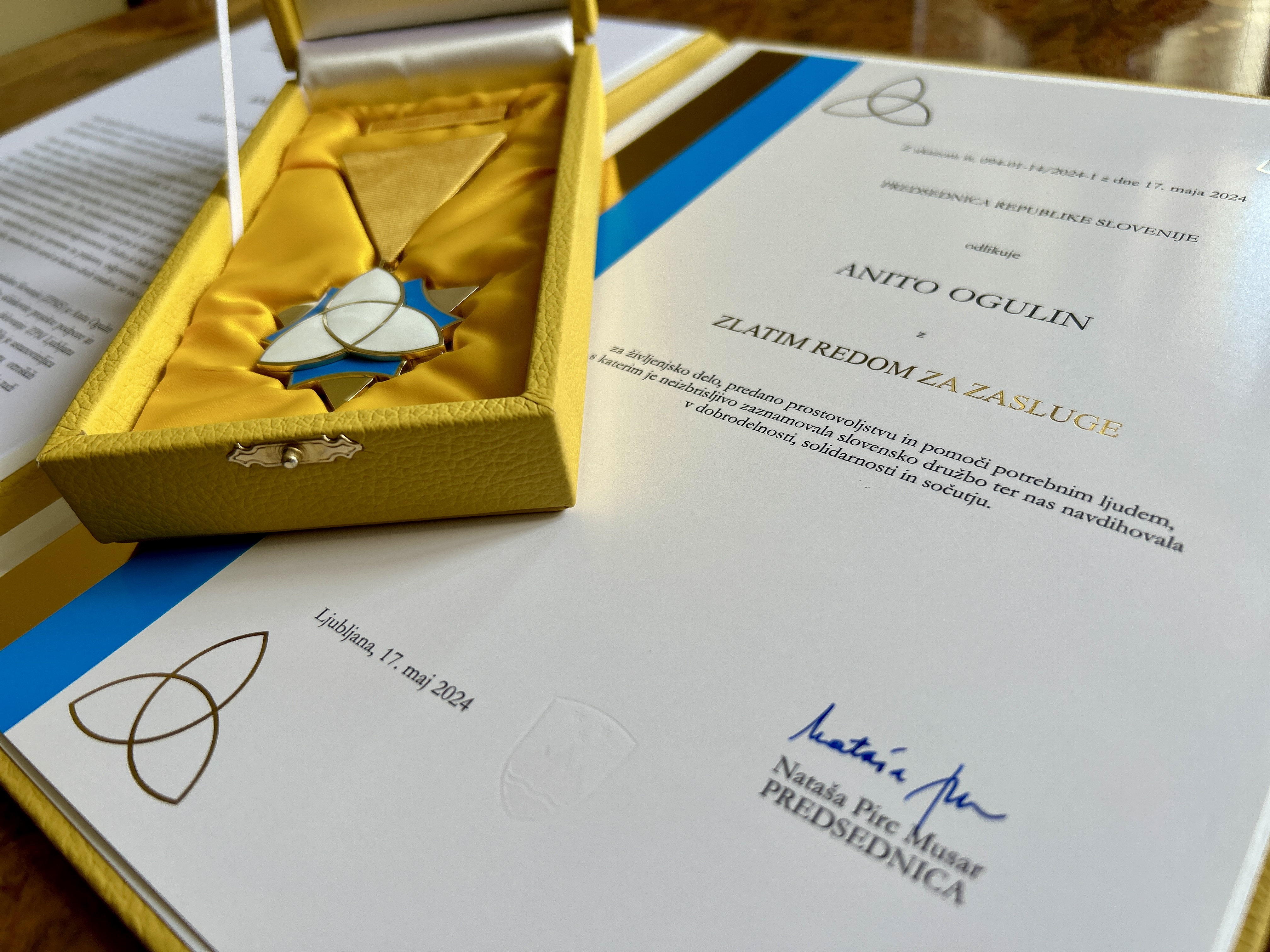 Predsednica Republike Slovenije Nataša Pirc Musar je Aniti Ogulin v znak hvaležnosti in spoštovanja za njeno življenjsko delo, predano prostovoljstvu in pomoči potrebnim ljudem, s katerim je neizbrisljivo zaznamovala slovensko družbo ter nas navdihovala v dobrodelnosti, solidarnosti in sočutju, podelila državno odlikovanje zlati red za zasluge.