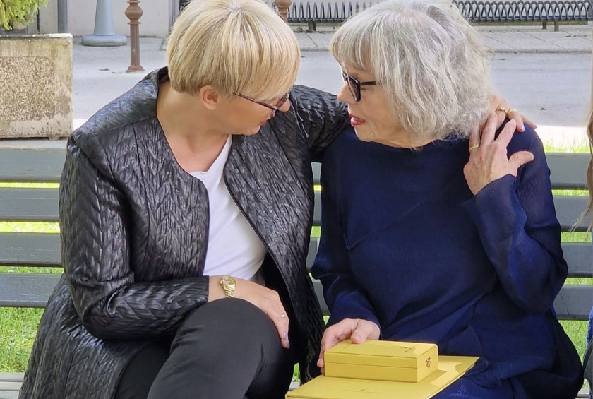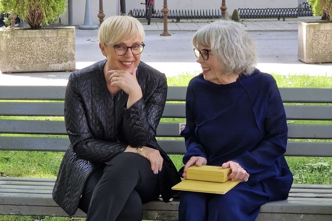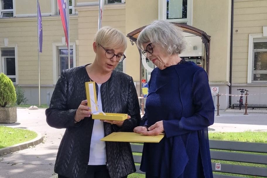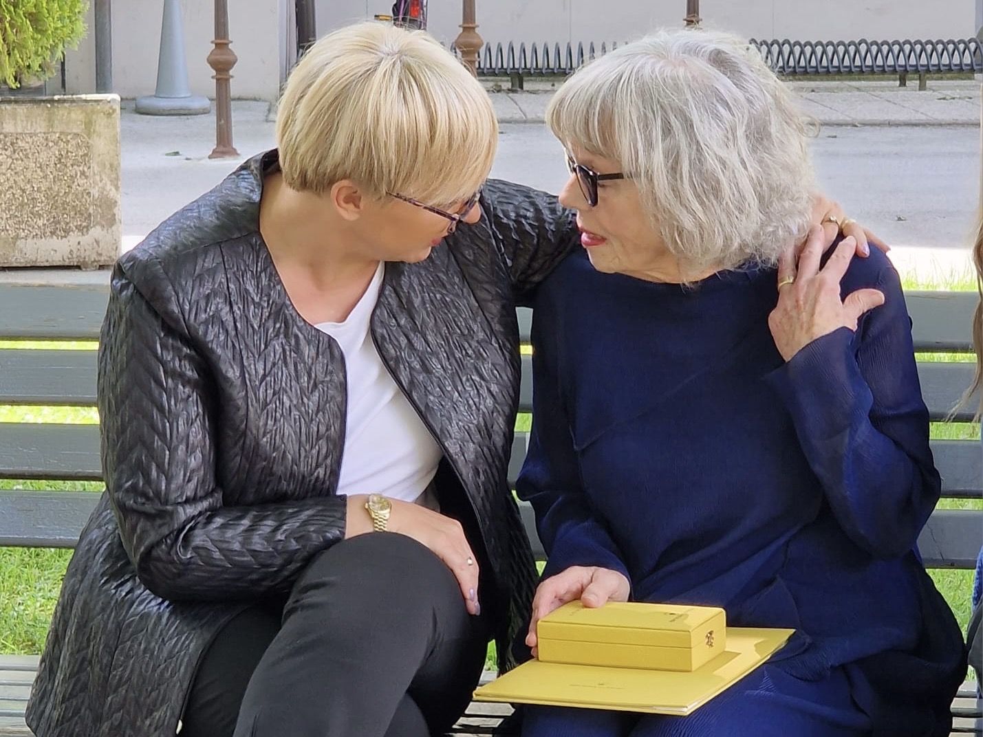 Predsednica Republike Slovenije Nataša Pirc Musar in prejemnica državnega odlikovanja Anita Ogulin v sproščenem pogovoru po vročitvi odlikovanja.