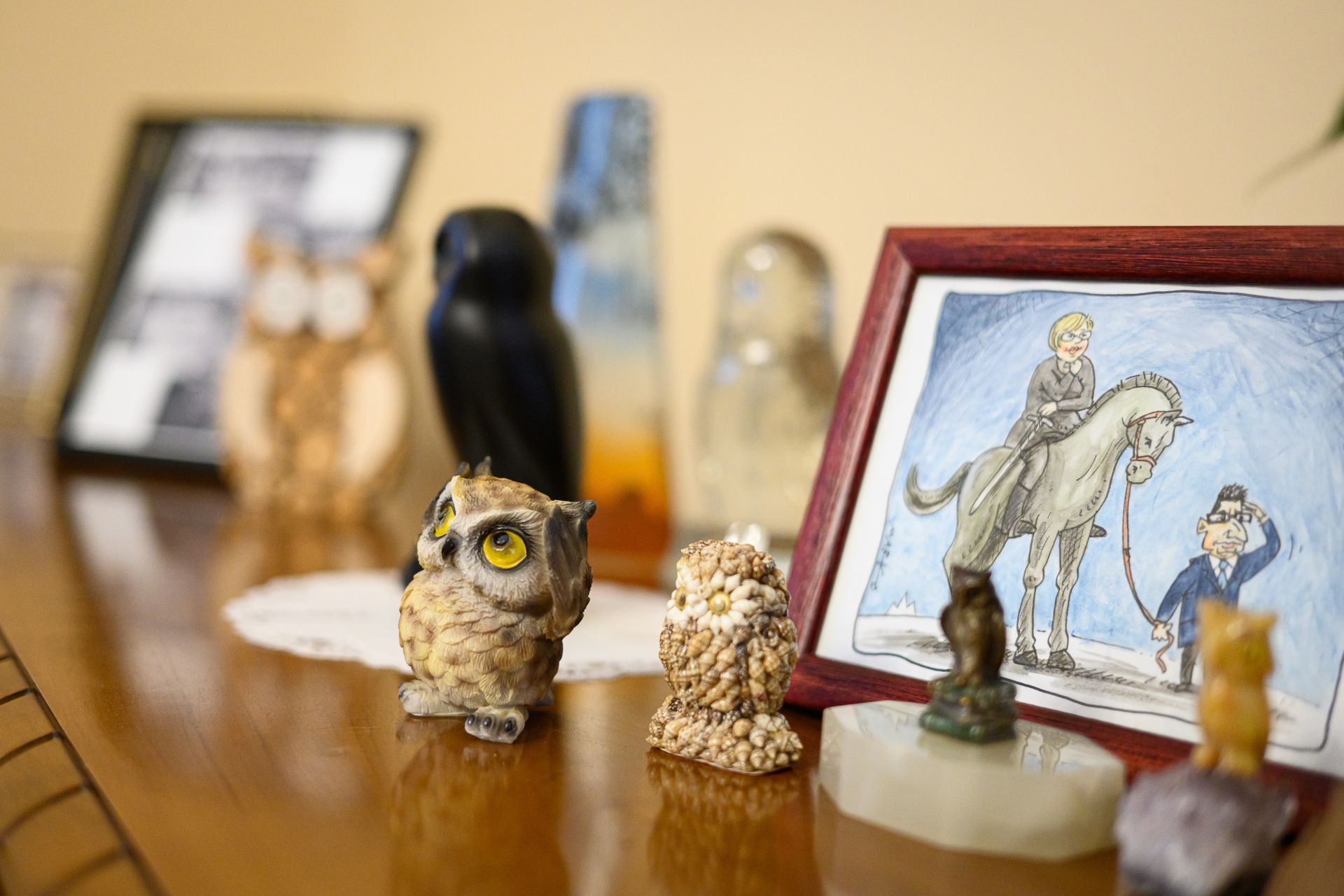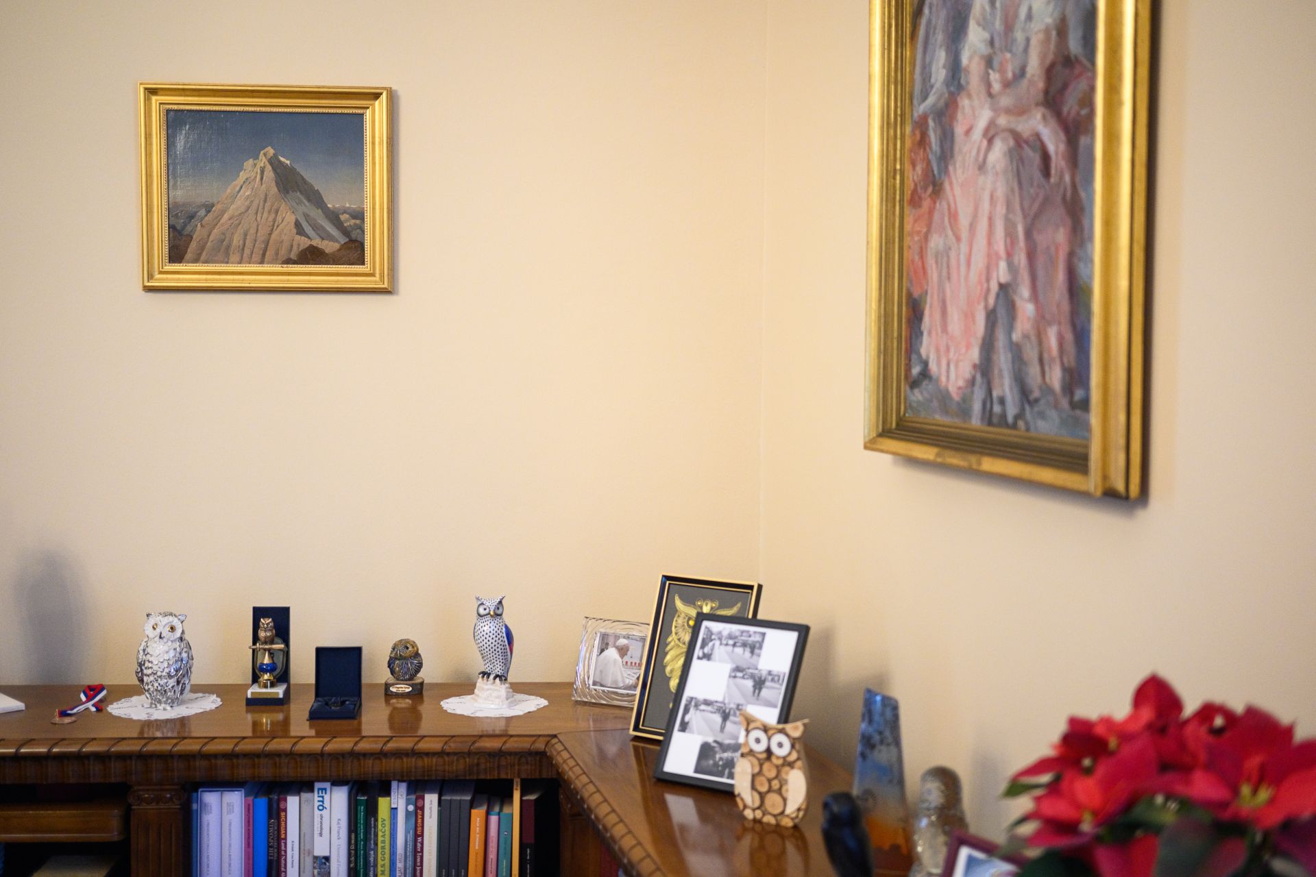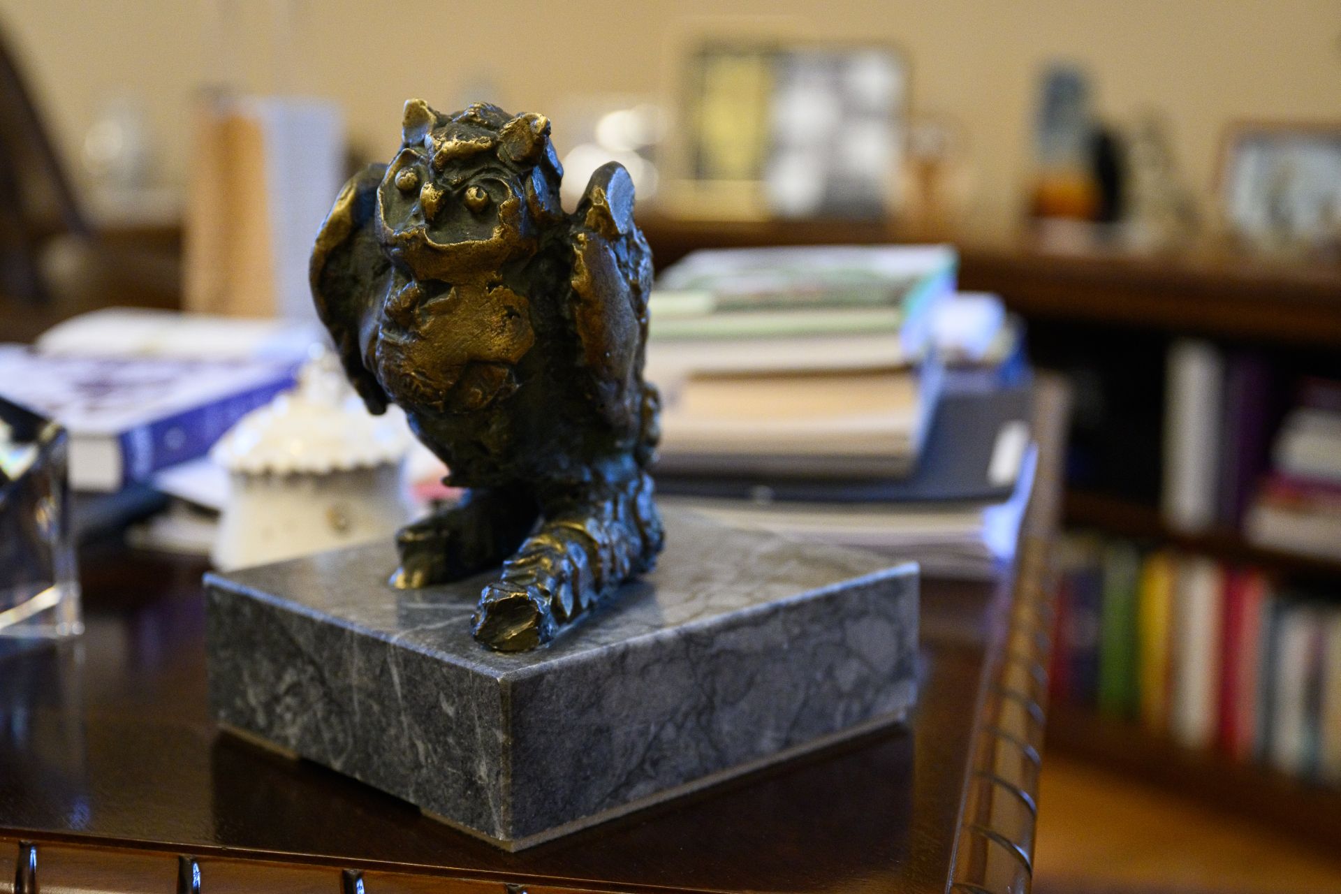 Pod slikama in na predsedničini mizi je poleg njenih delovnih pripomočkov kar nekaj takih ali drugačnih sov, ki jih predsednica zbira. Na vogalu pisalne mize je bronast kip sove, ki ga je, tako kot Lipicanca na stopnišču, ustvaril Janez Boljka. Kip je predsednico pričakal na njeni mizi kot družinsko darilo ob prevzemu predsedniške funkcije 23. decembra lani.