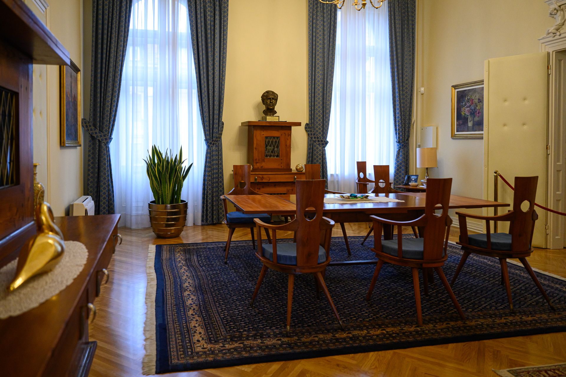 Nasproti predsedničine mize stoji velik portret cesarice Elizabete iz časa njene mladosti, ki ga je naslikal Mihael Stroj, eden vodilnih slovenskih slikarjev 19. stoletja. Tudi to je naša zgodovina: ko je bil položen temeljni kamen predsedniške palače in ko je palača dobila uporabno dovoljenje, je bila cesarica Sissi še na prestolu.