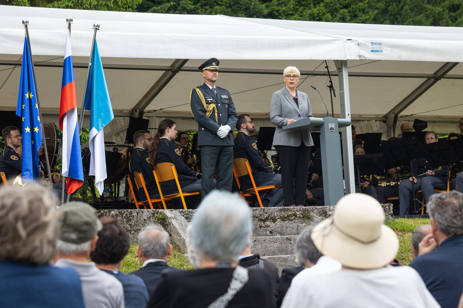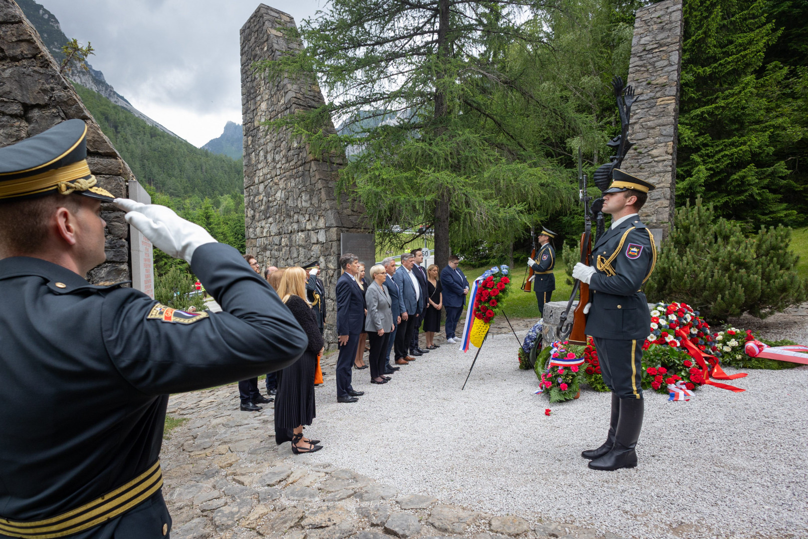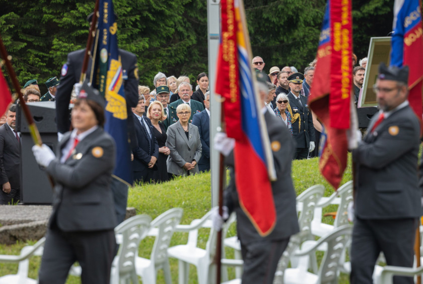 Pred slovesnostjo je predsednica Republike Slovenije položila venec k spominskem obeležju Obtožujem/J'accuse in se poklonila trpljenju in pogumu taboriščnikov v Ljubelju.
