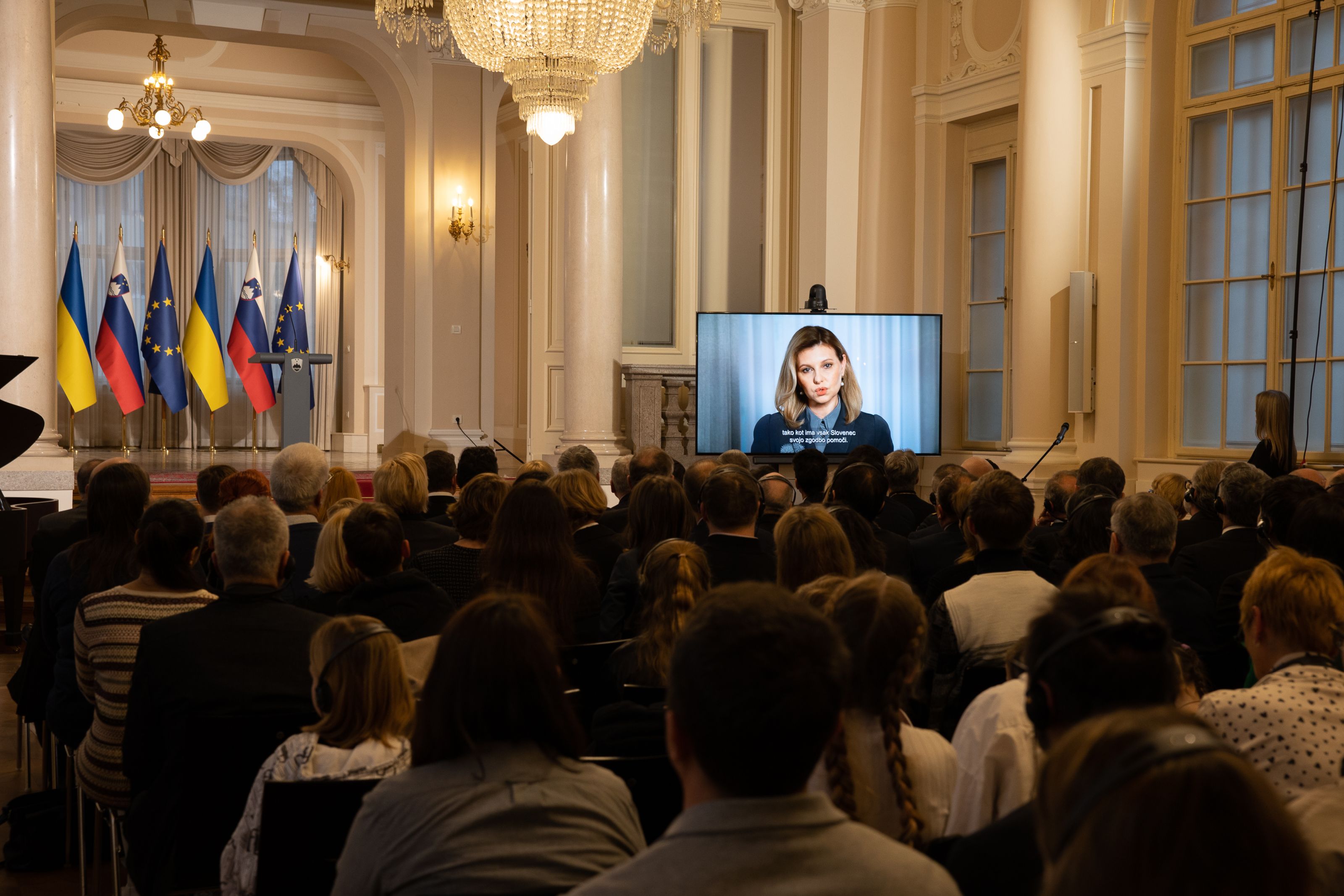 Zbrane v Predsedniški palači je v posebnem videoposnetku, posnetem za to priložnost, pozdravila Olena Zelenska, soproga predsednika Ukrajine Volodimirja Zelenskega. »Rada bi vam osebno povedala, kako smo vam v Ukrajini hvaležni zato, ker nas podpirate v vsem tem težkem letu,« je dejala prva dama Ukrajine in poudarila, da bo pomoč Slovenije in njenih ljudi za vedno ostala v srcih prebivalk in prebivalcev Ukrajine.