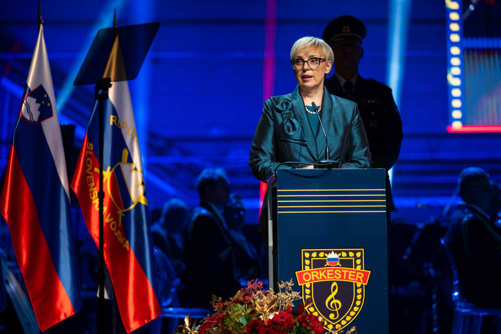 Predsednica republike je v slavnostnem nagovoru člane Orkestra Slovenske vojske nagovorila kot pomembne nosilce glasbene kulture ter hkrati eno najvidnejših podob Slovenske vojske in države: »Ko smo med vami, ne vidimo le dovršene podobe, zloščenih uniform in glasbil ter izpiljenih tonov, temveč vidimo zaupanje in nezlomljivi duh ljudi, združenih v skupnem poslanstvu in prisegi, da bodo s svojo držo, glasbo in veščinami služili ljudem in domovini.« Ob tem se jim je v imenu Republike Slovenije iskreno zahvalila za zavzetost, izjemno kakovost, plemenitost in pripadnost.