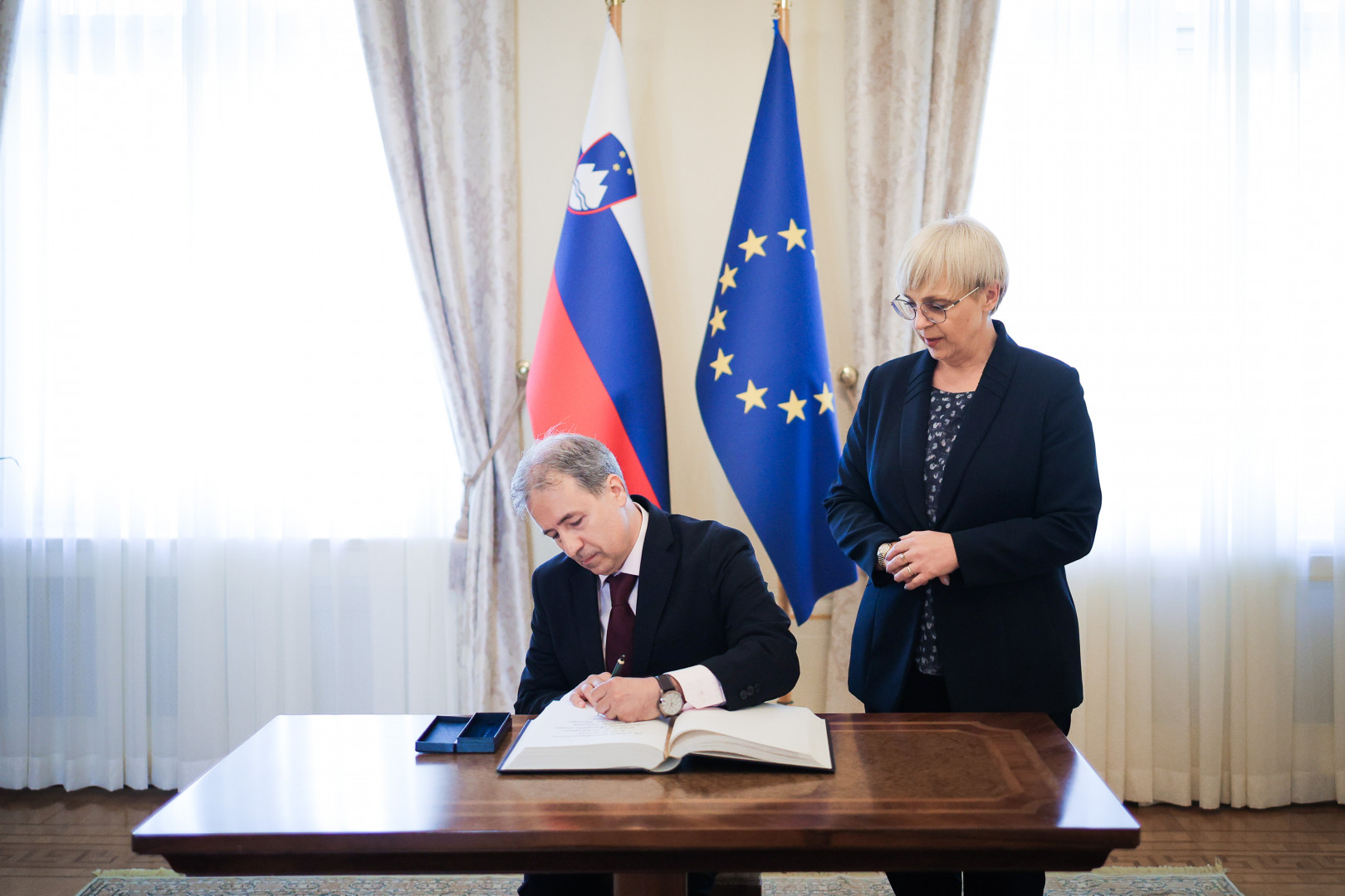 Predaji poverilnega pisma je sledil vpis v knjigo gostov predsednice Republike Slovenije, nato pa pogovor z veleposlanikoma o odnosih med Slovenijo in državama, ki jih predstavljata, ter priložnostih za njihovo krepitev.