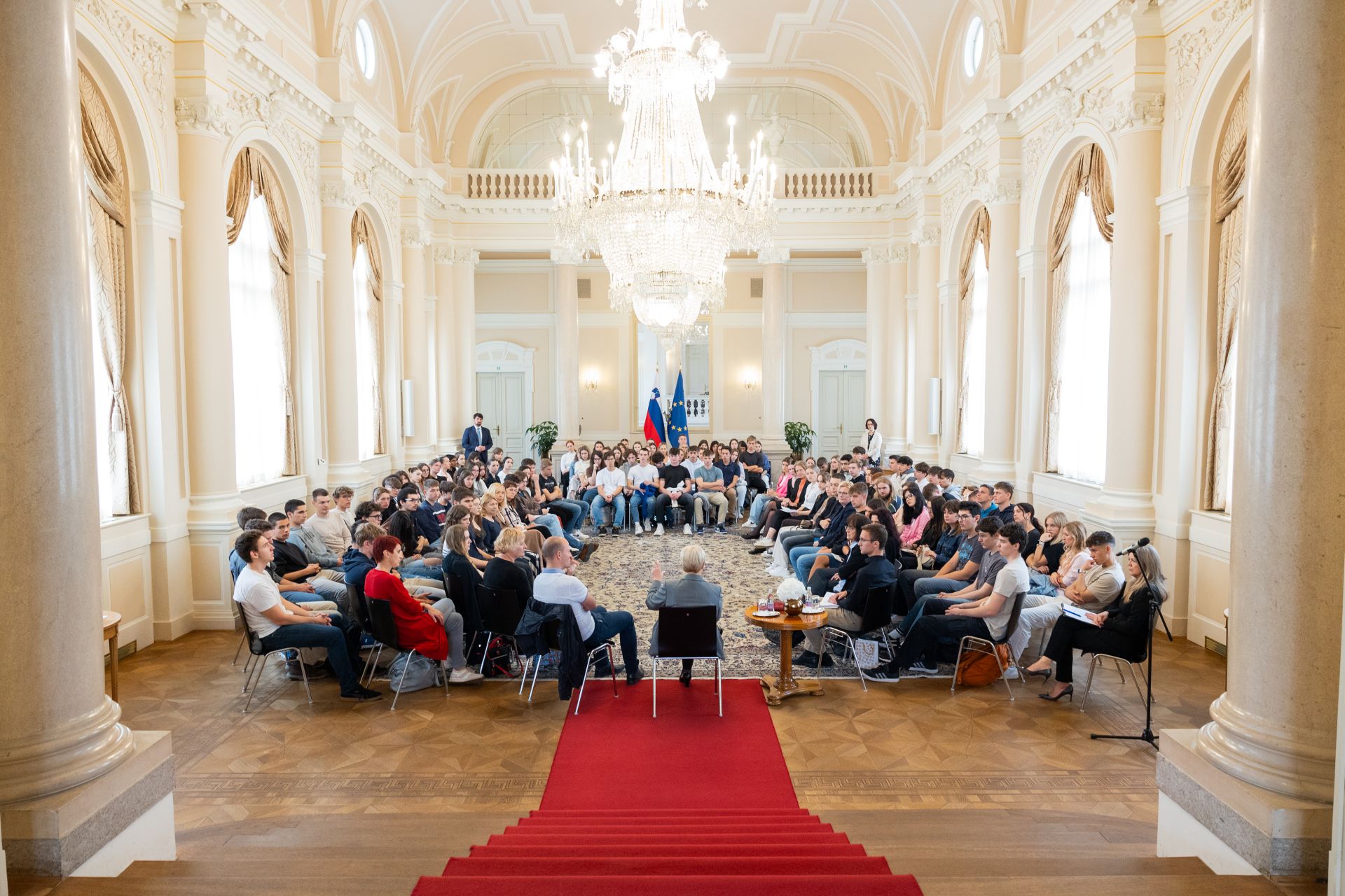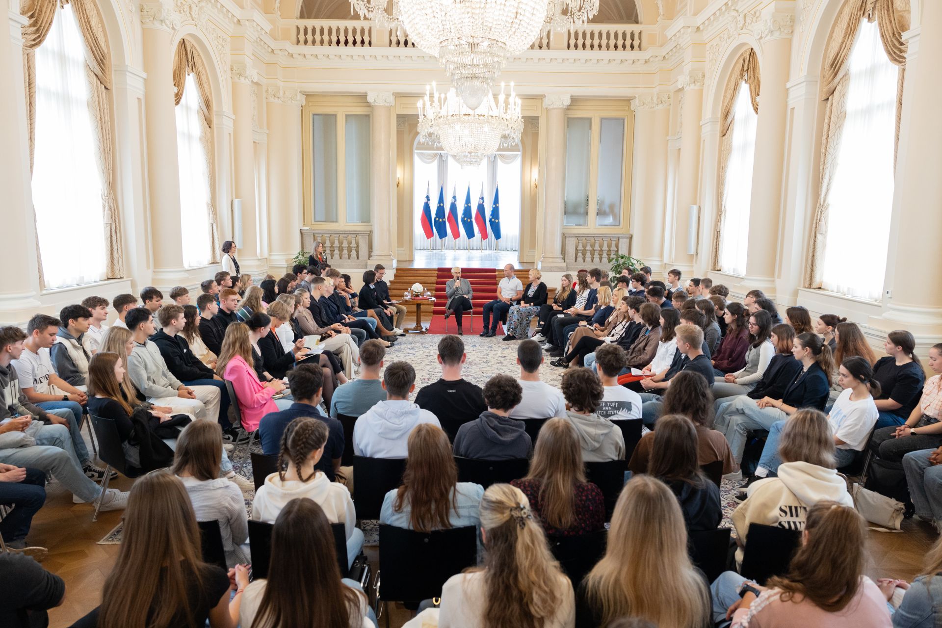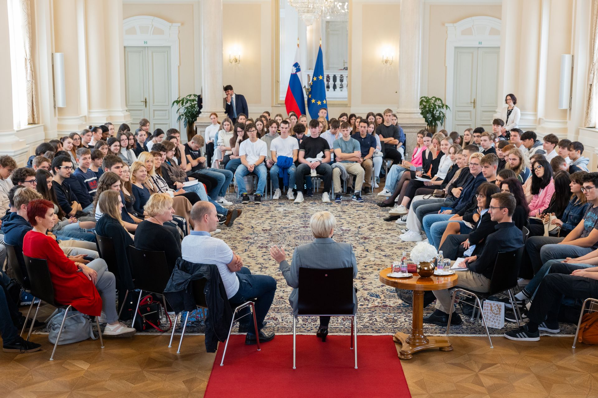 »Izjemno vesela sem, da ste prišli v Predsedniško palačo,« je dijakinje in dijake pozdravila predsednica Republike Slovenije. »Veliko sem med mladimi, ker mi je zelo pomembno, da se lahko z vami odkrito pogovarjam in delim vtise o tem, kaj Slovenija je, in kaj želimo, da Slovenija bo. Brez vas si teh razprav preprosto ne predstavljam,« je dejala predsednica, ki ji srečanja z ljudmi, še posebej z mladimi, dajejo veliko energije za delo, ki ga opravlja. »Rada sem med vami, ker se vsak dan od vas naučim nekaj novega in začutim, kako razmišljate in kako doživljate družbo in svet,« je dejala gimnazijkam in gimnazijcem iz Kamnika, ki so ji v nadaljevanju zastavili vsebinsko zelo raznolika vprašanja s področja njenih pristojnosti in tudi širše. Razpravljali so o pomenu delujočega sistema javnega zdravstva, ki mora biti dostopno vsem, o sodobnih družbenih izzivih, kot so boj proti podnebni krizi, beg možganov, človekove pravice in enakost spolov ter kapitalizem. Spregovorili so tudi o razmerah v Gazi ter vlogi Organizacije združenih narodov in Varnostnega sveta pri mirnem reševanju sporov, ohranjanju mednarodnega miru in varnosti.