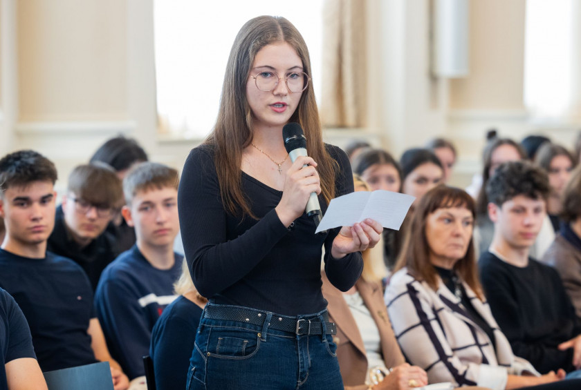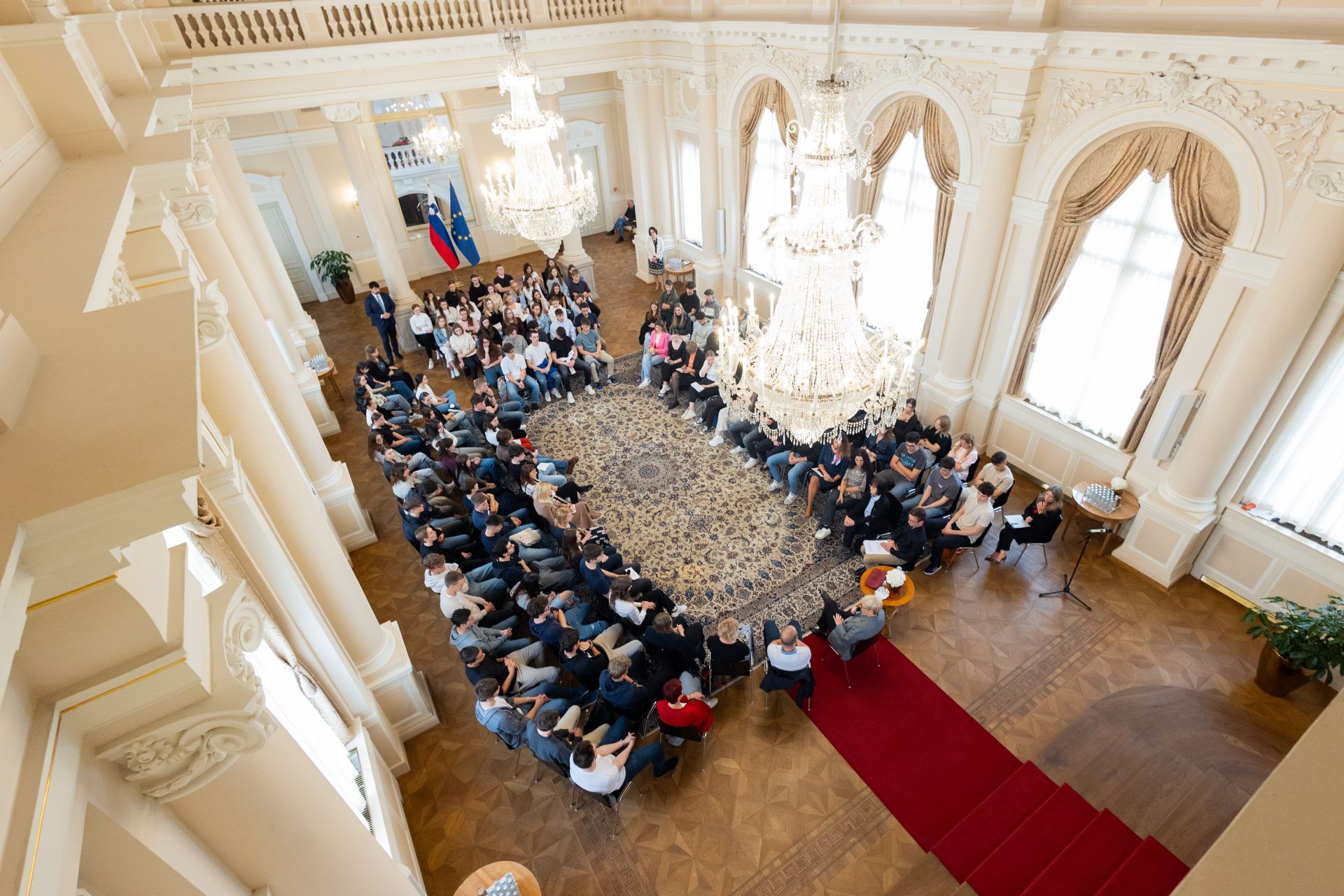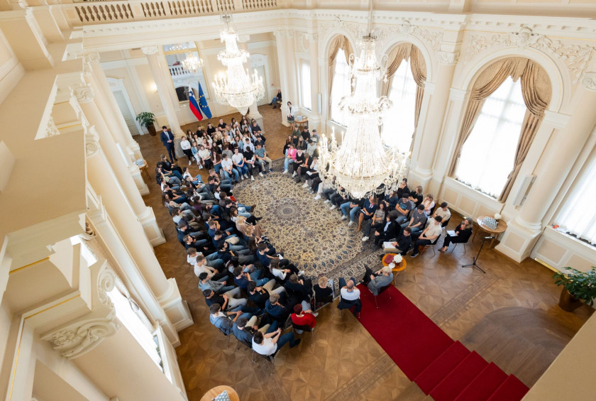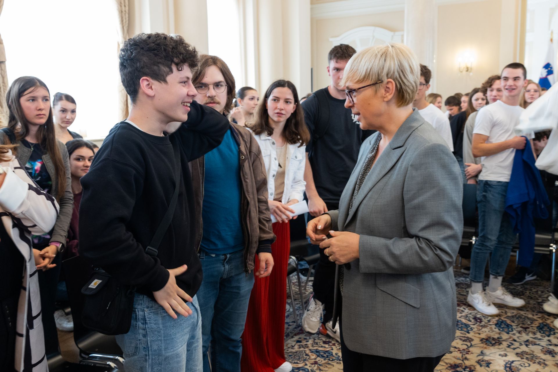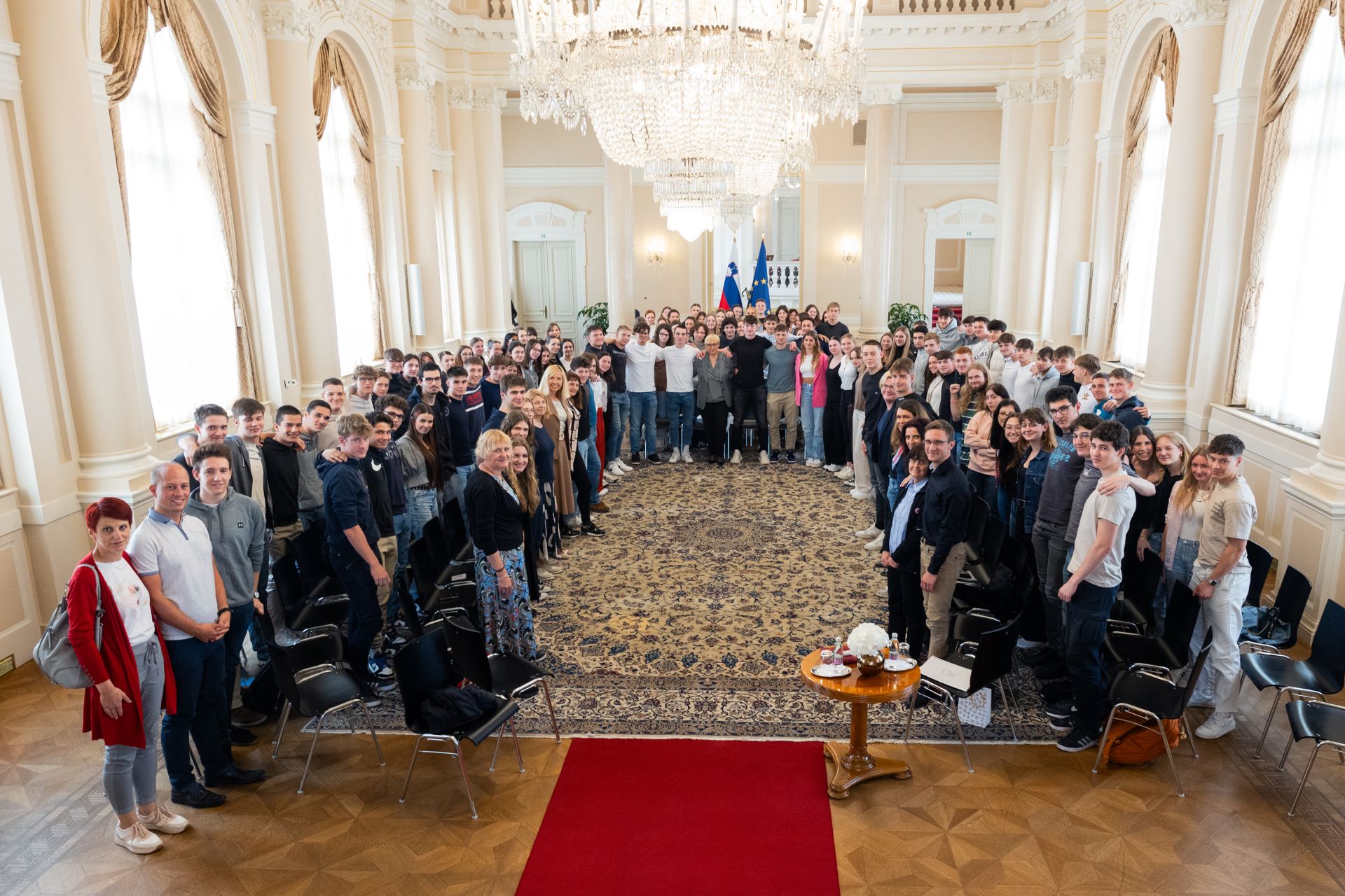 »Izjemno vesela sem, da ste prišli v Predsedniško palačo,« je dijakinje in dijake pozdravila predsednica Republike Slovenije. »Veliko sem med mladimi, ker mi je zelo pomembno, da se lahko z vami odkrito pogovarjam in delim vtise o tem, kaj Slovenija je, in kaj želimo, da Slovenija bo. Brez vas si teh razprav preprosto ne predstavljam,« je dejala predsednica, ki ji srečanja z ljudmi, še posebej z mladimi, dajejo veliko energije za delo, ki ga opravlja. »Rada sem med vami, ker se vsak dan od vas naučim nekaj novega in začutim, kako razmišljate in kako doživljate družbo in svet,« je dejala gimnazijkam in gimnazijcem iz Kamnika, ki so ji v nadaljevanju zastavili vsebinsko zelo raznolika vprašanja s področja njenih pristojnosti in tudi širše. Razpravljali so o pomenu delujočega sistema javnega zdravstva, ki mora biti dostopno vsem, o sodobnih družbenih izzivih, kot so boj proti podnebni krizi, beg možganov, človekove pravice in enakost spolov ter kapitalizem. Spregovorili so tudi o razmerah v Gazi ter vlogi Organizacije združenih narodov in Varnostnega sveta pri mirnem reševanju sporov, ohranjanju mednarodnega miru in varnosti.
