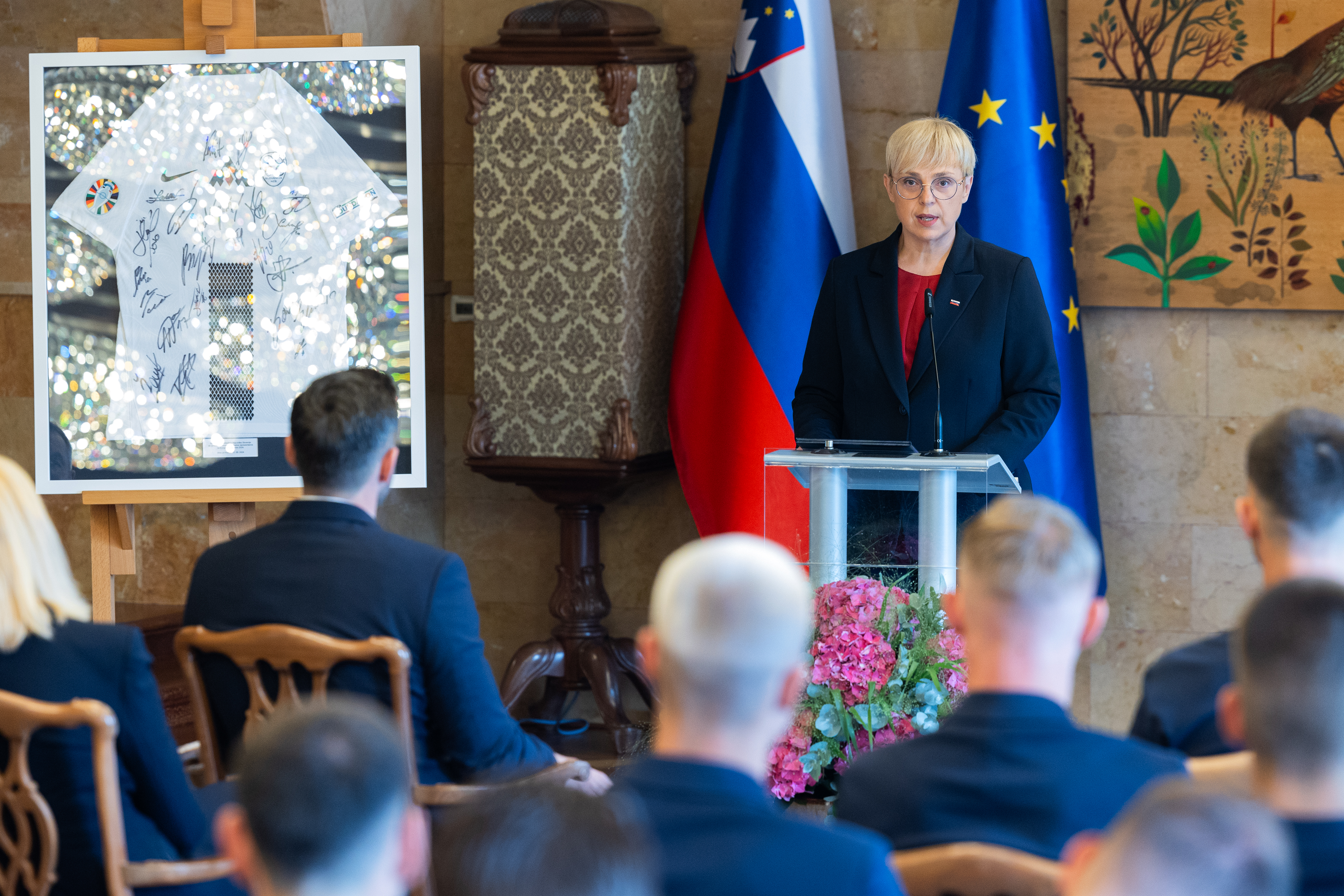 Na koncu je nogometašem čestitala za njihov dosežek in jim zaželela veliko uspeha na prihajajočem prvenstvu. »Vaš uspeh je navdih za mlade po vsej Sloveniji. Mladi, ki vas spremljajo, vidijo, da so sanje dosegljive, da je trdo delo smiselno in da se lahko z vztrajnostjo in predanostjo dosežejo velike stvari. Vi ste vzorniki prihodnjih generacij in vaše zgodbe bodo navdihovale mnoge mlade športnike,« je zaključila predsednica in dodala znani navijaški slogan, ki slovenske navijačice in navijače spremlja vse od osamosvojitve in si ga pa njenem mnenju nihče ne bi smel prisvojiti: »Kdor ne skače, ni Sloven'c!«
