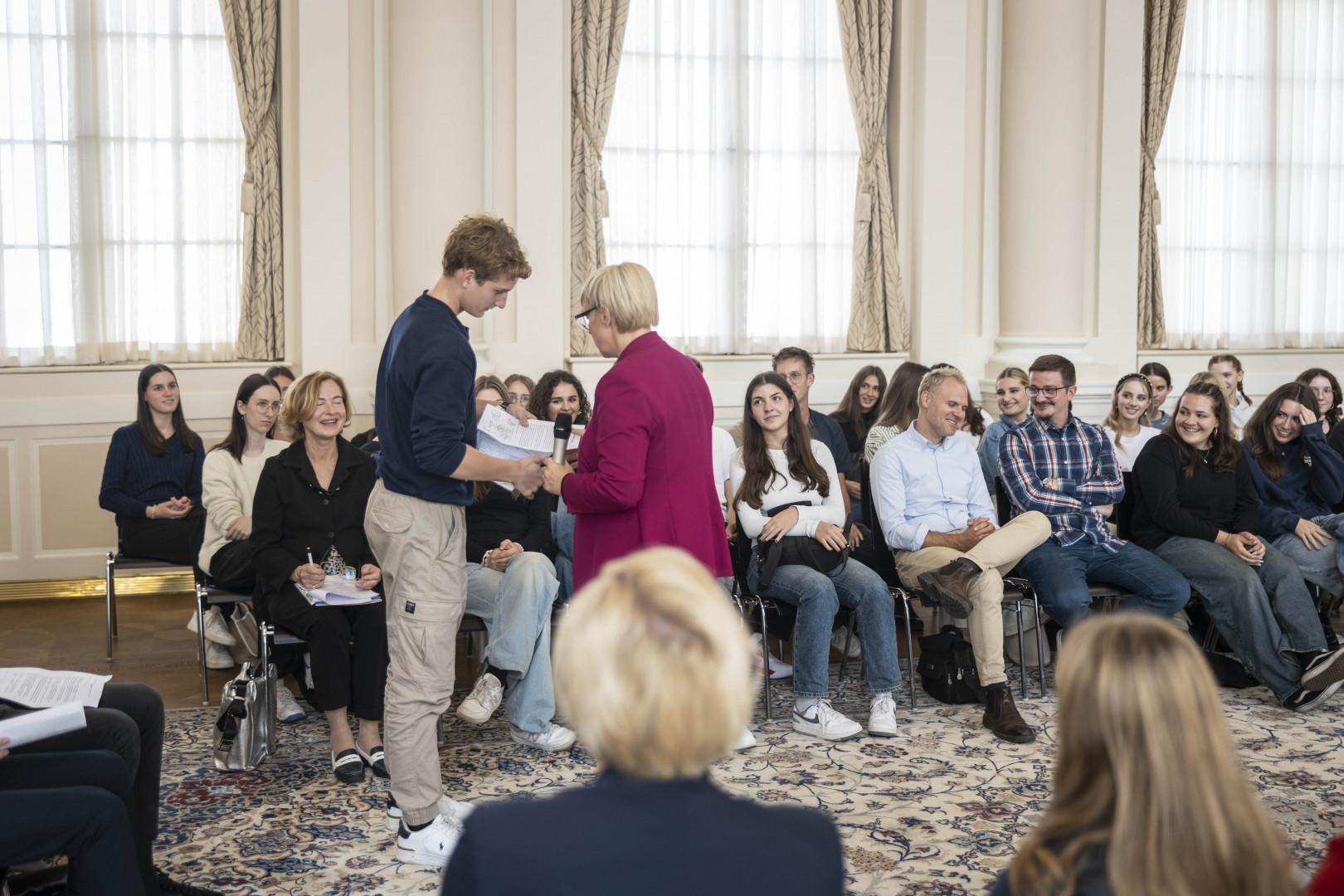 Predsednica Republike Slovenije Nataša Pirc Musar je sprejela 102 dijakinji in dijaka tretjega letnika Prve Gimnazije Maribor, ki so jo v Predsedniški palači obiskali v okviru predmeta Aktivno državljanstvo. V pogovoru z njimi jih je pozvala, naj se tudi sicer aktivno vključujejo v demokratične procese v državi, saj lahko le tako sooblikujejo družbo prihodnosti, v kateri bodo živeli in ustvarjali. Obenem pa dodala, da se ji zdi prav, da odločevalci slišijo in upoštevajo tudi mnenje mladih.
