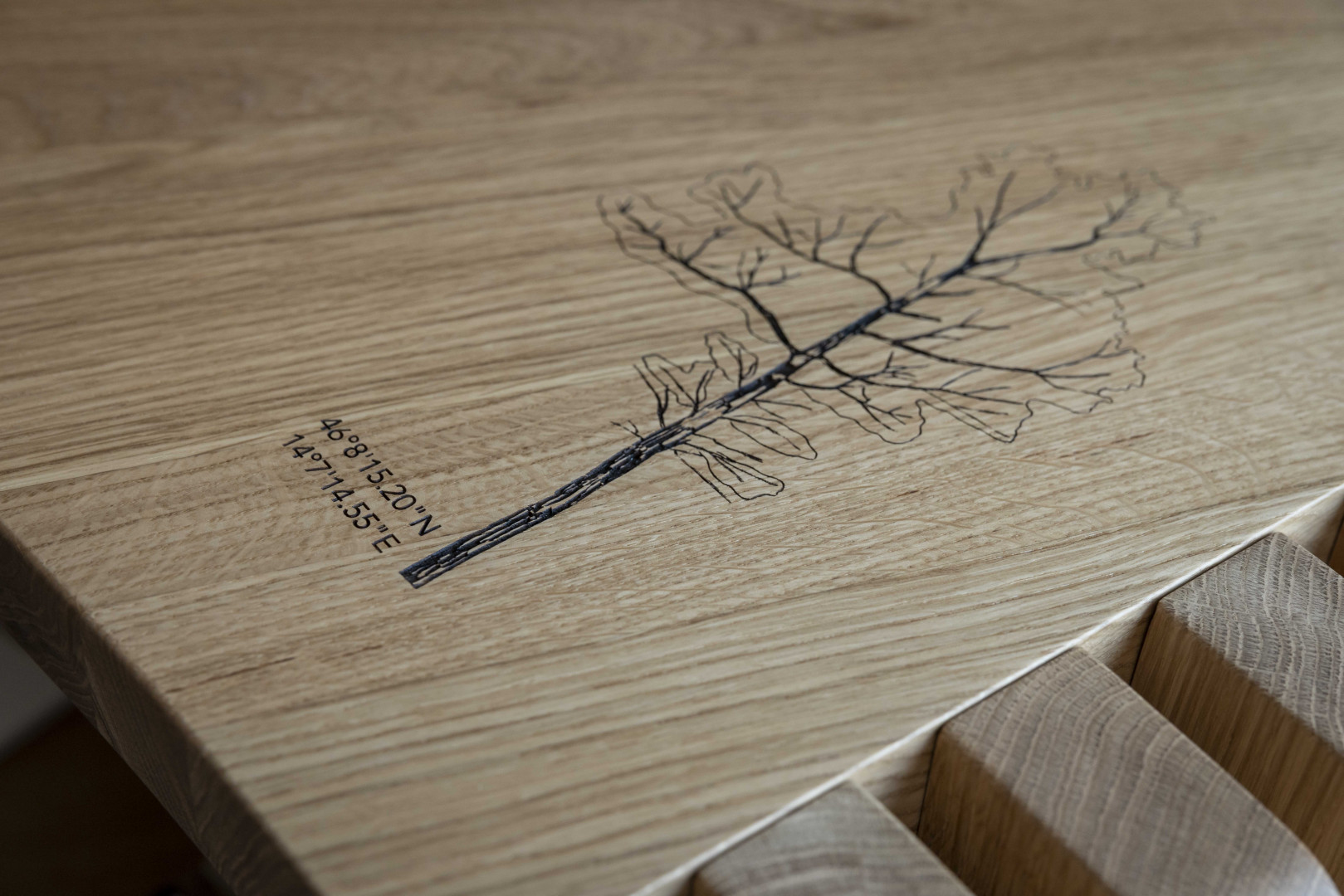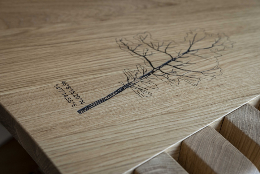 Njena zgodba se začne v Poljanski dolini, kjer je gozdar izbral mogočen hrast – temelj novega pohištva. Hrastovo jedro dopolnjuje les več kot 200 let starega kozolca toplarja iz iste doline, ki simbolizira slovensko podeželsko tradicijo.