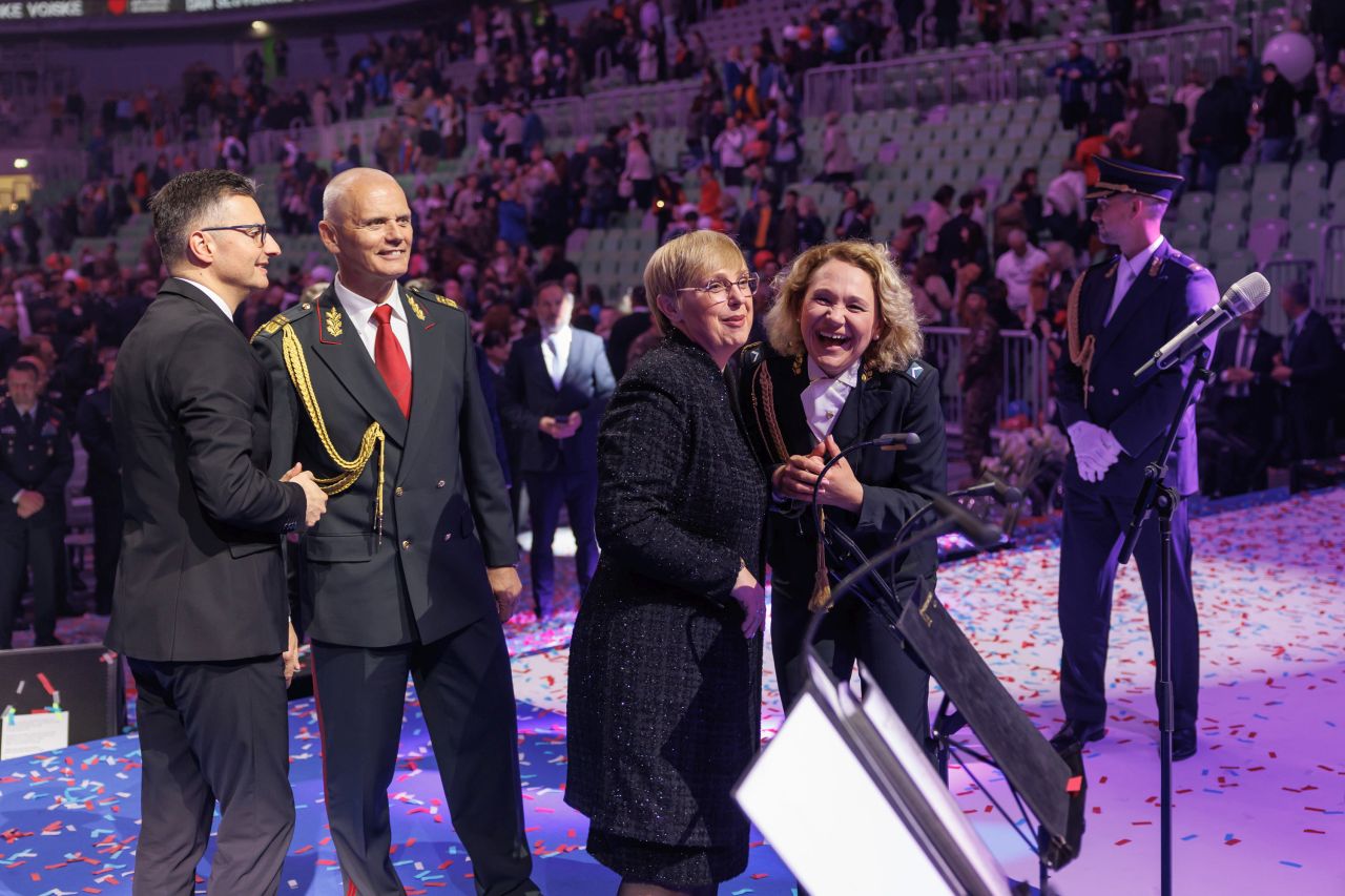 Predsednica Republike Slovenije in vrhovna poveljnica obrambnih sil je v slavnostnem govoru čestitala pripadnicam in pripadnikom Slovenske vojske ob njihovem prazniku, se jim zahvalila za predano in profesionalno delo ter pozdravila letošnjo posebno obeležitev, za katero meni, da prispeva k njeni odprtosti in dostopnosti. »Posebej želim poudariti pomen odprtosti vojaške organizacije. Zelo se mi zdi pomembno, da se ponovno začnejo tkati močnejše vezi, razumevanje in naklonjenost med vojsko in družbo, med uniformiranimi pripadniki Slovenske vojske in prebivalci v različnih okoljih,« je dejala predsednica republike ob povabilu, da skupnost obudi občutke ponosa in varnosti iz časa nastajanja slovenske države in njene vojske. »Kjerkoli smo jo srečali, nam je predstavljala navdih, upanje in občutek sreče, ker imamo lastno državo,« je spomnila in dodala, da pripadnice in pripadnike Slovenske vojske tudi danes odlikuje enaka srčnost in predanost nalogam in skupnosti.