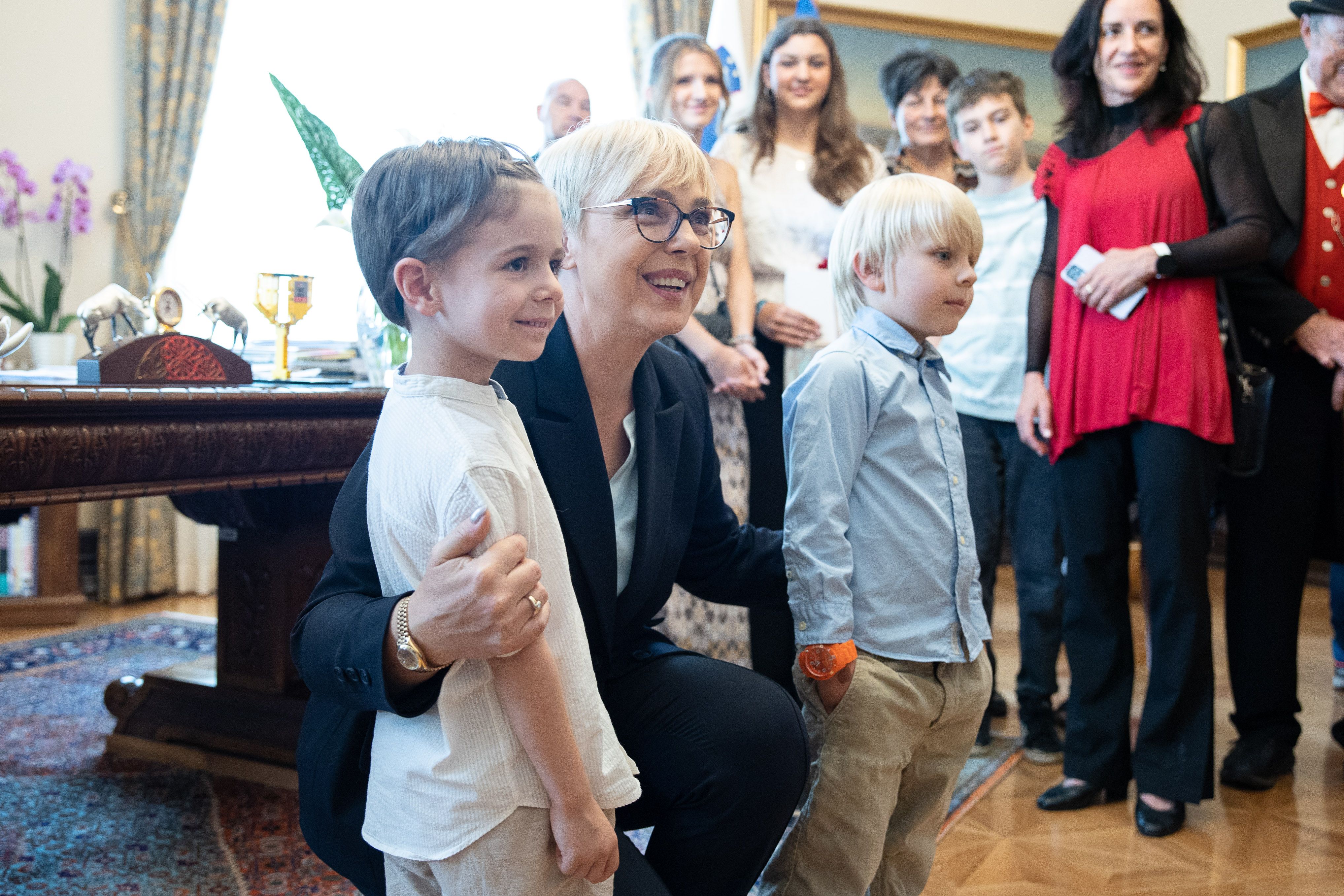 Predsednica se pogovarja z dvema majhnima dečkoma.