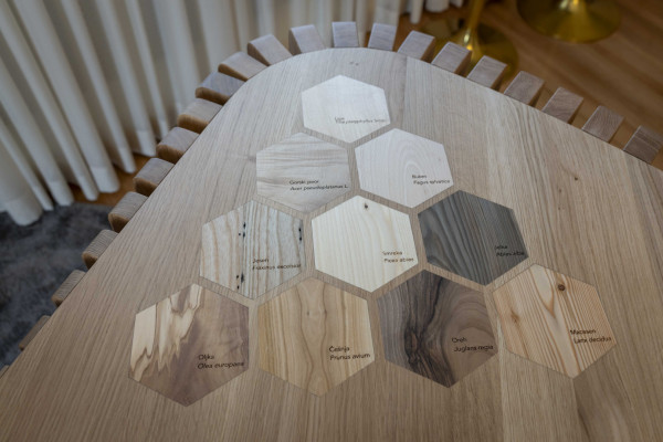 Posebnost mize je deset različnih slovenskih vrst lesa, vključenih v obliki popolnih šesterokotnikov – motiv, ki spominja na satovje. Med njimi najdemo: jelko iz blatnega kala, staro več kot 4600 let, oreh, gorski javor rebraš, bukev (iz ribniške kuhinjske deske), smreko, jesen (iz Elanove smuči), oljko, češnjo, macesen in simbolno lipo iz vrta Polhograjske graščine.