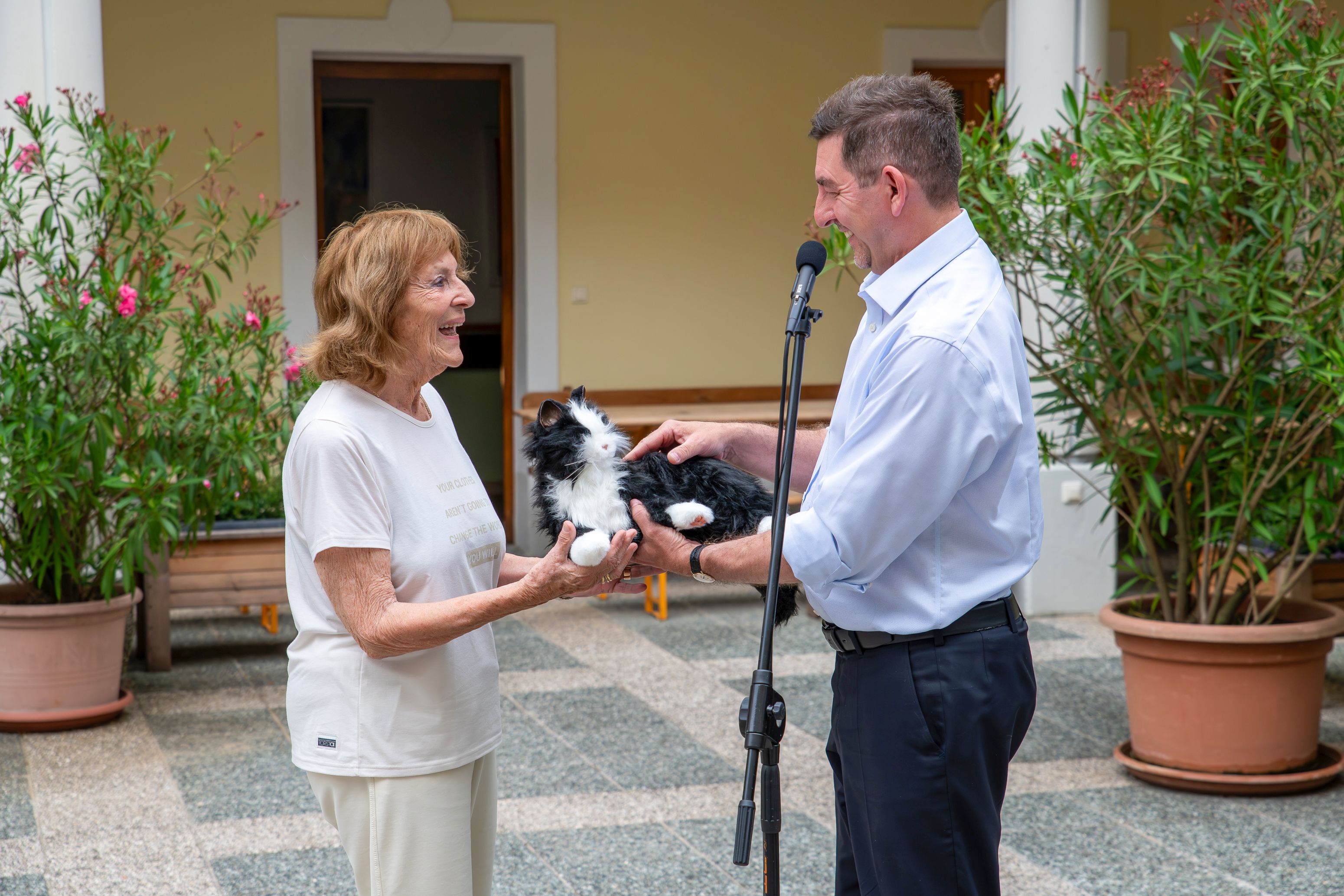 Dr. Musar je vse prisotne pozdravil in jim ob tej priložnosti podaril robotsko terapevtsko mačko, ki bo stanovalcem in osebam z demenco v Domu sv. Jožefa Celje delala družbo in pripomogla k lepšemu in bolj kakovostnem življenju. Dr. Musar se je ob koncu obiska posebej zahvalil direktorici, dr. Ireni Švab Kavčič in ostalemu osebju doma, ki opravlja izjemno pomembno delo.