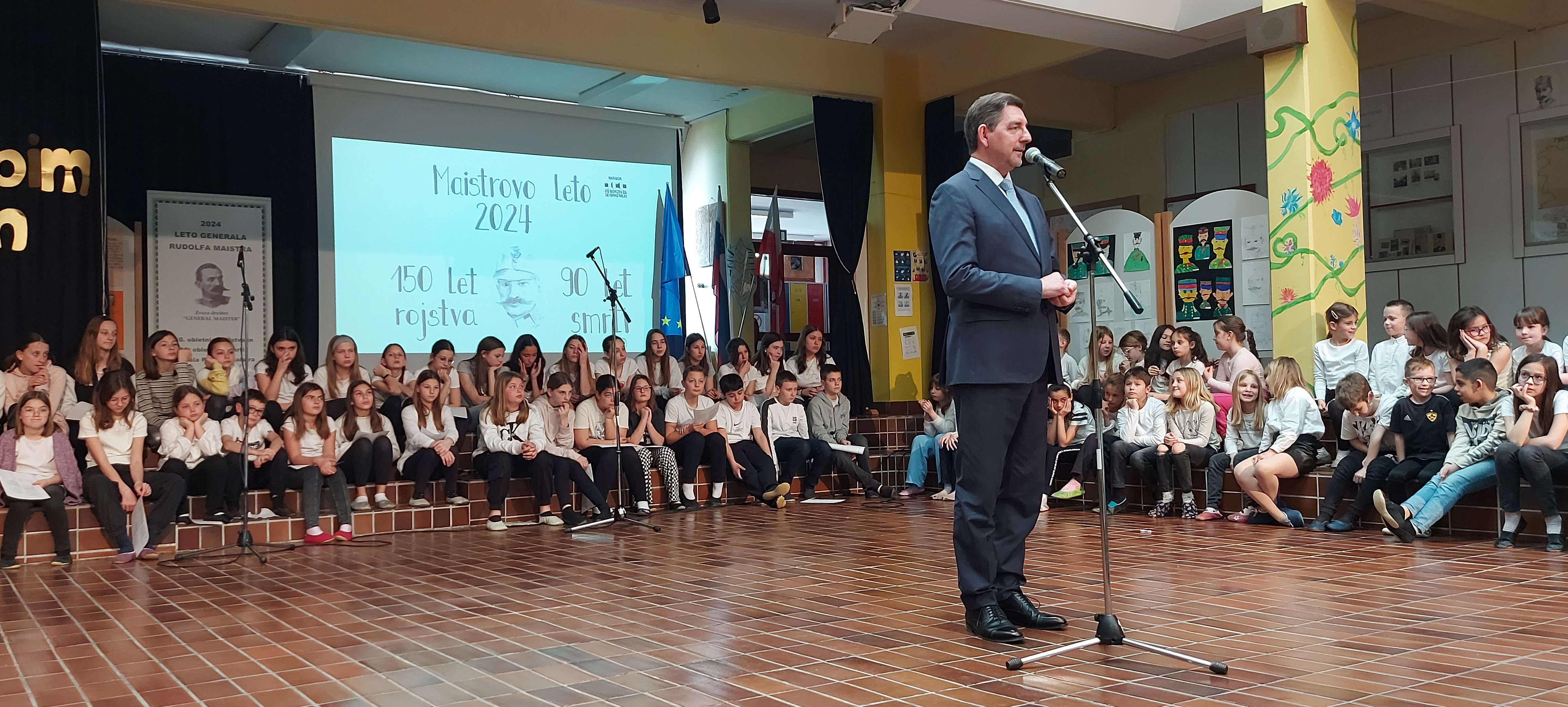 Vse navzoče je ob tej posebni priložnosti, s katero obeležujemo 150. letnico rojstva in 90.obletnico smrti generala Rudolfa Maistra, nagovoril v imenu predsednice republike dr. Nataše Pirc Musar. Ob začetku nagovora je najprej prenesel njene pozdrave predsednici Zveze društev general Maister, ravnateljici OŠ borcev za severno mejo Maribor ter vsem navzočim učiteljem in učencem. Pozdravil tovrstne dogodke, ob letu generala Rudolfa Maistra in ob tem izpostavil, da ni bil samo vojaški poveljnik, temveč strateg in pesnik, predvsem pa je bil zelo pogumen in domoljuben človek.